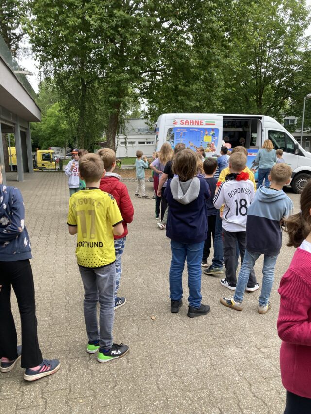 Heute, am letzten Schultag vor den Ferien, wurde die versprochene Überraschung eingelöst. In der Sportprojektwoche sind die Kinder insgesamt 3023 Runden über den Sportplatz gelaufen. Deshalb kam heute der Eiswagen…