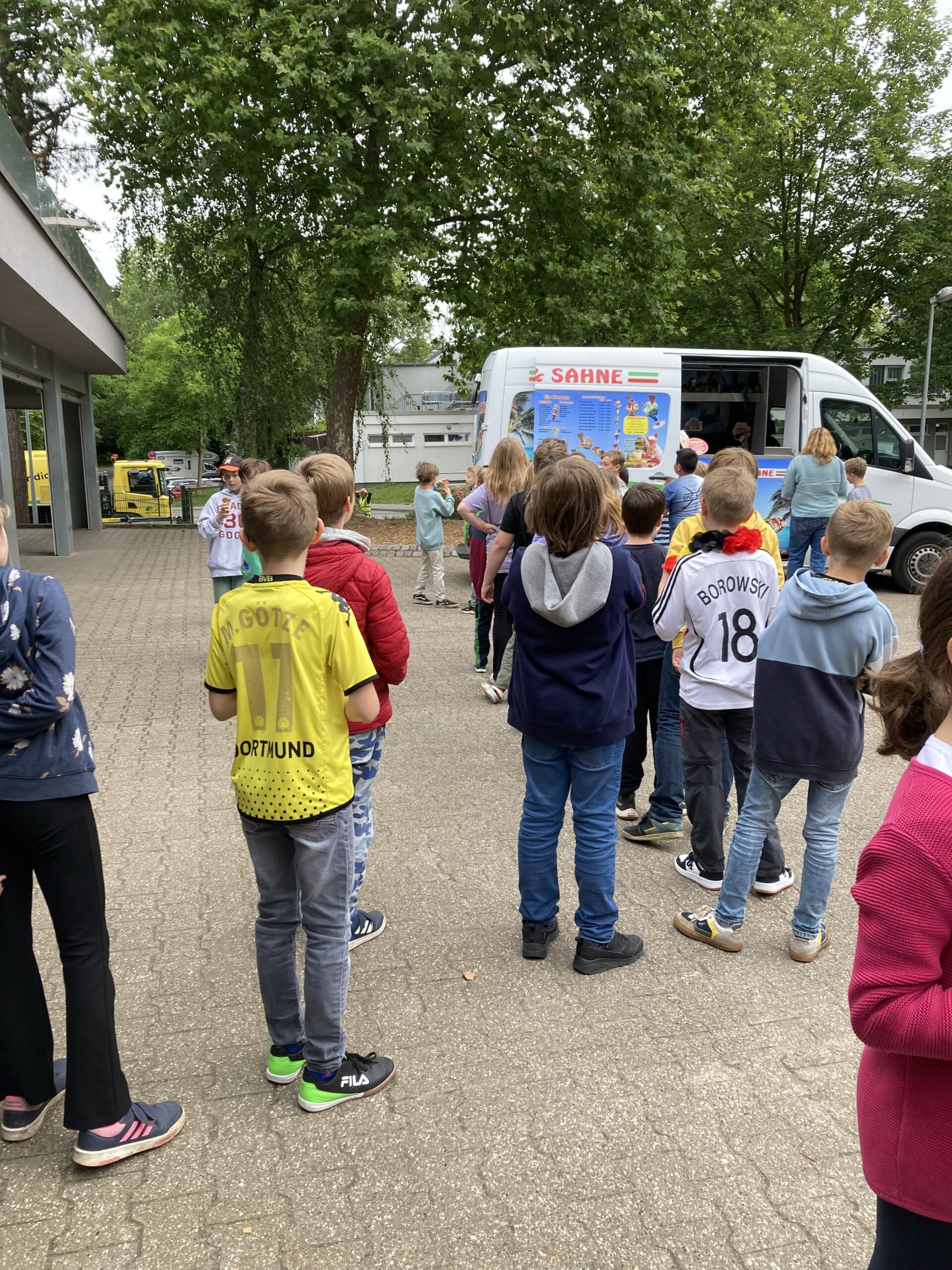 Heute, am letzten Schultag vor den Ferien, wurde die versprochene Überraschung eingelöst. In der Sportprojektwoche sind die Kinder insgesamt 3023 Runden über den Sportplatz gelaufen. Deshalb kam heute der Eiswagen und alle Kinder durften sich eine Eiskugel aussuchen.