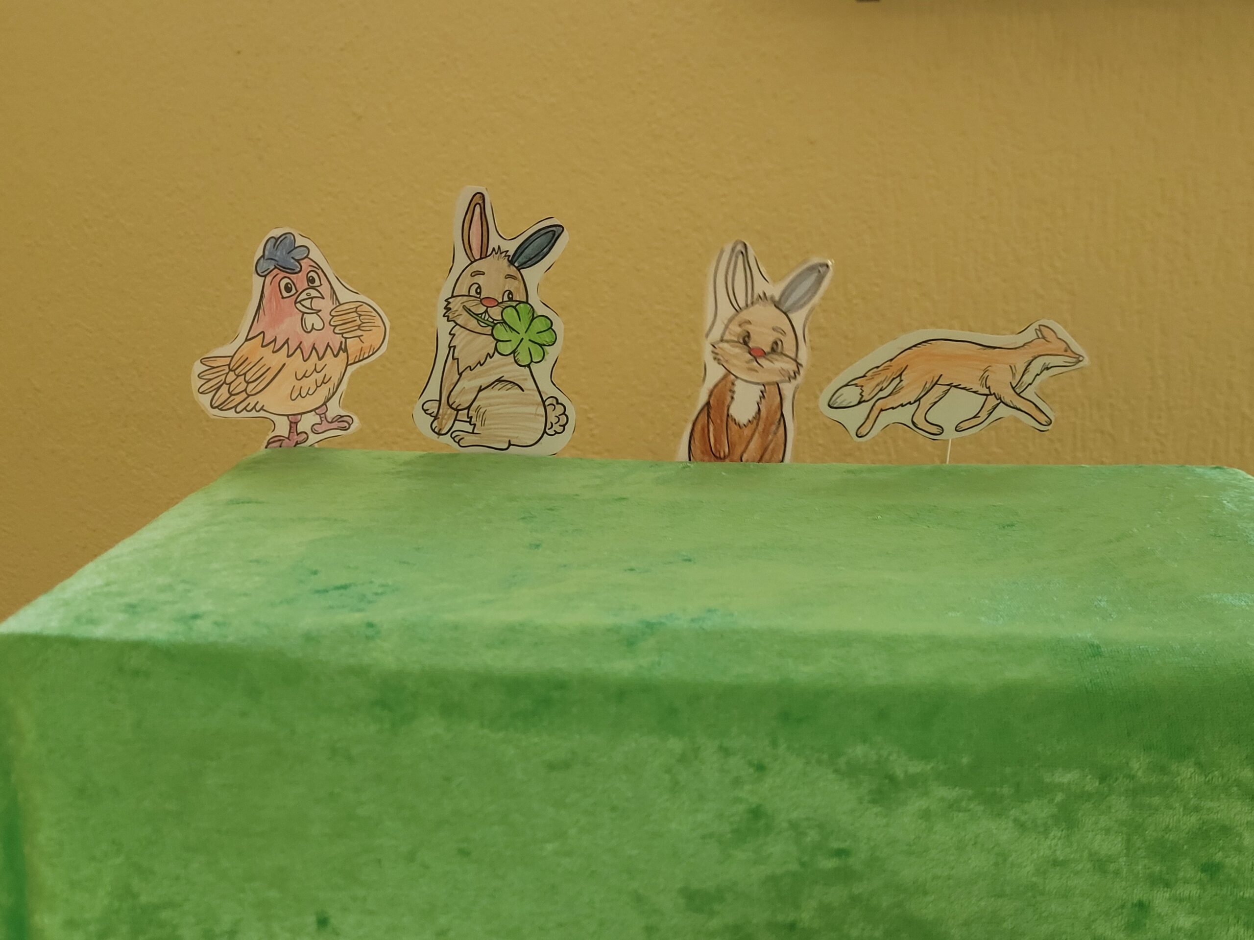 In den letzten Wochen haben die Giraffen und die Roten Pandas sich im Deutsch- und Kunstunterricht mit dem Gedicht „Der Hase mit der roten Nase“ von Helme Heine beschäftigt. Nachdem sie es gelesen und dazu gearbeitet hatten, haben sie es auswendig gelernt und Stabpuppen gebastelt. Nun ging es ans Üben. Ziel war es, das Gedicht mit Hilfe der Stabpuppen und des Kamishibais, also eines Erzähltheaters, den anderen Kindern und ihren Lehrerinnen zu präsentieren.