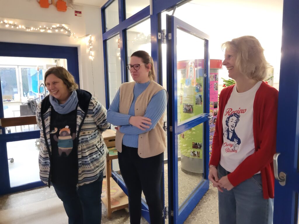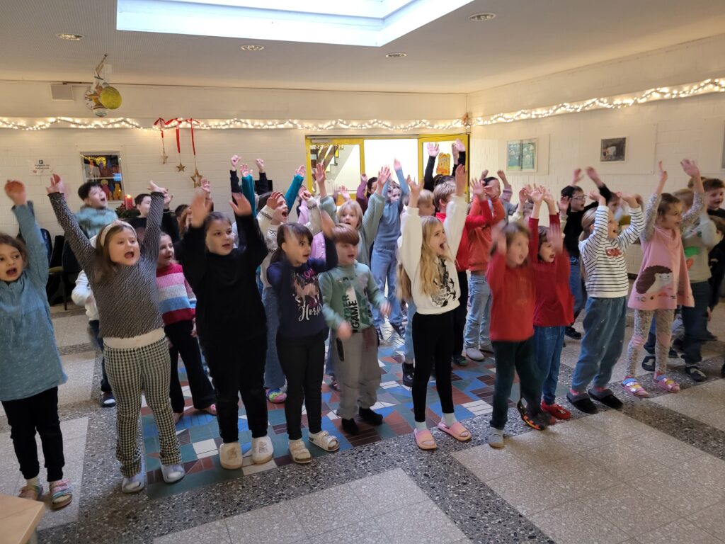 Heute gab es für unsere Schulleiterin Frau Pflug, unsere Konrektorin Frau Höfer und unsere Sekretärin Frau Kaul eine kleine Adventsüberraschung. Als die drei ins Foyer kamen, standen dort die Giraffen und Roten Pandas und sangen ihnen ein wunderschönes Weihnachtslied vor. Dabei tanzten die Zweitklässlerinnen und Zweitklässler zu einer Choreografie, die sie sich selbst ausgedacht hatten. Alle drei waren ganz begeistert und strahlten um die Wette! Auch die Kinder hatten viel Freude beim Verschenken! Das war eine tolle Überraschung so kurz vor Weihnachten, dem Fest der Freude!