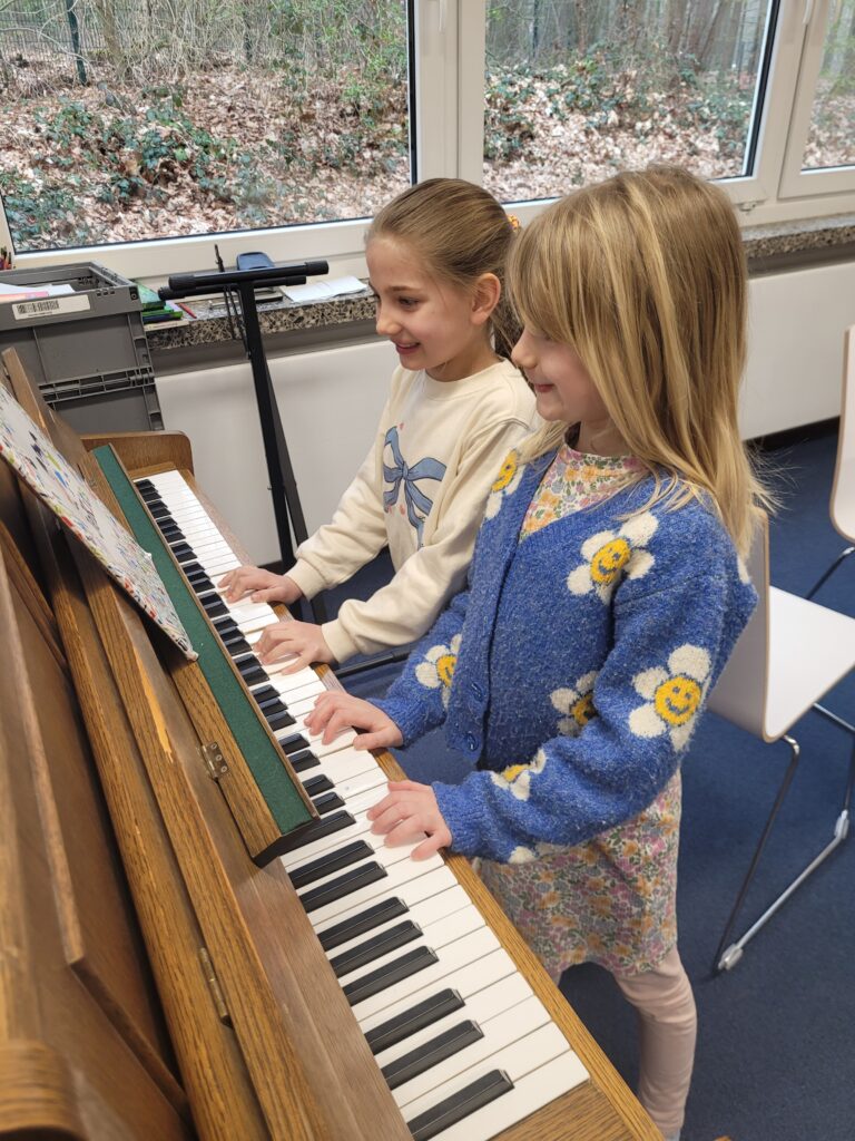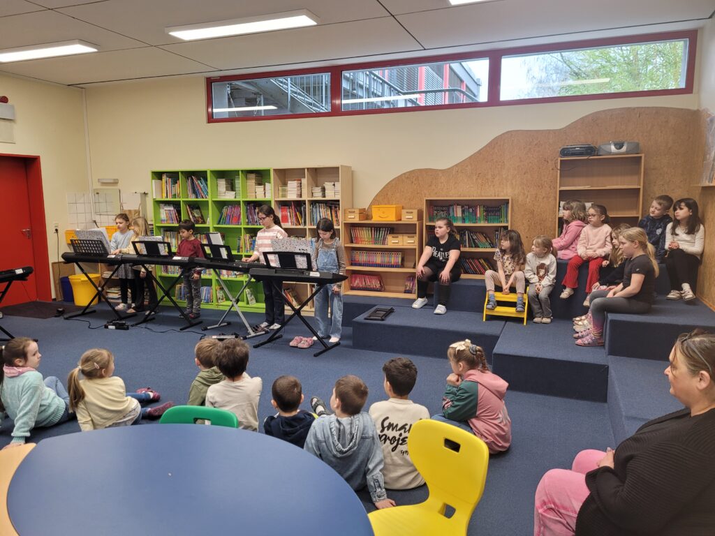 Die ersten Klassen haben im Jekits-Unterricht in diesem Schuljahr viele verschiedene Instrumente kennengelernt. Bald dürfen sie nun überlegen, ob sie selbst auch ein Instrument lernen möchten. Um einen kleinen Vorgeschmack darauf zu bekommen, was sie dann erwarten würde, haben ein paar Zweitklässlerinnen und Zweitklässler ihnen auf ihren Keyboards und dem Klavier etwas vorgespielt. Da staunten unsere „Kleinen“ aber, was die „Großen“ in einem guten halben Jahr schon gelernt haben!