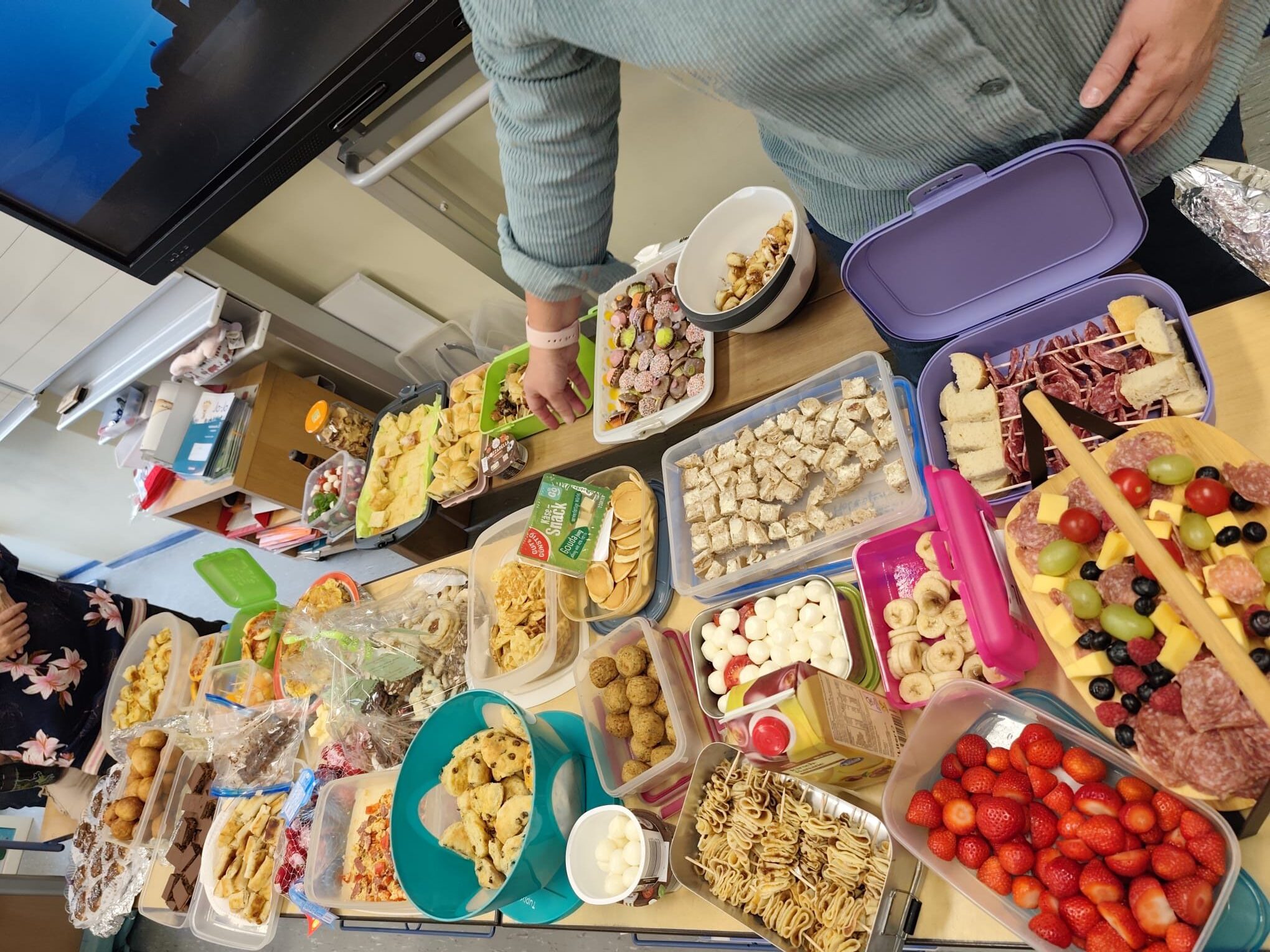 Wir haben am Freitag vor den Herbstferien mit unserer Patenklasse gefrühstückt. Es war ein besonderes Frühstück, nämlich ein Räuberfrühstück. Bei einem Räuberfrühstück bringt jeder etwas mit und jeder kann sich von allem was nehmen. Wir hatten eine riesig große Auswahl an Leckereien. Wir waren gut mit Muffins, Minipizza, Waffeln, Pfannkuchen, Laugenecken, Weintrauben, Beeren, Bananenhäppchen, Laugenstangen mit Käse, Keksen, Käsehäppchen, Tomaten, Scones, Samosas, Milchbrötchen mit Karamellcreme, Toast mit Schokostreuseln, Apfelkuchen, bosnischem Kuchen, Miniwürstchen, kleinen Frikadellen, Falafel, Fetaröllchen, Salamischeiben, Schokobrötchen, Käse-Mandarinenspieße, Sucuk, Tomate-Mozzarella und vielen anderen Dingen versorgt. Die Monster und die Mäuse haben sich mit großem Appetit über das bunte Buffet hergemacht und viele interessante Gespräche über das Essen und andere Dinge geführt.