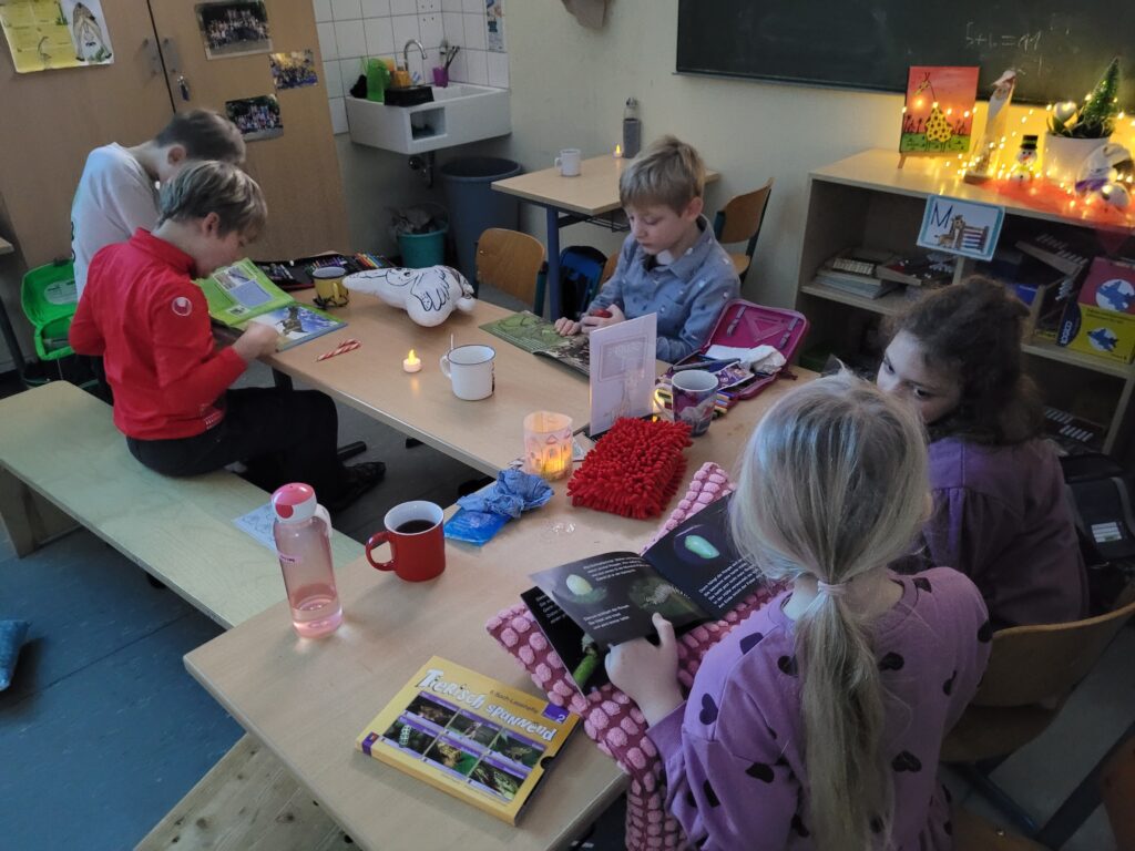 Heute hatten die Giraffen und Roten Pandas eine besondere Überraschung im Klassenadventskalender: Eine gemeinsame Tee-Lesestunde! Jedes Kind hatte einen Becher und ein Kissen mitgebracht und durfte sich eine Sorte von verschiedenen Weihnachtstees aussuchen. Dann wurde es gemütlich: Mit ihren duftenden Teetassen und einem Buch ihrer Wahl machten es sich alle bequem und lasen gemütlich bei Weihnachtsmusik.