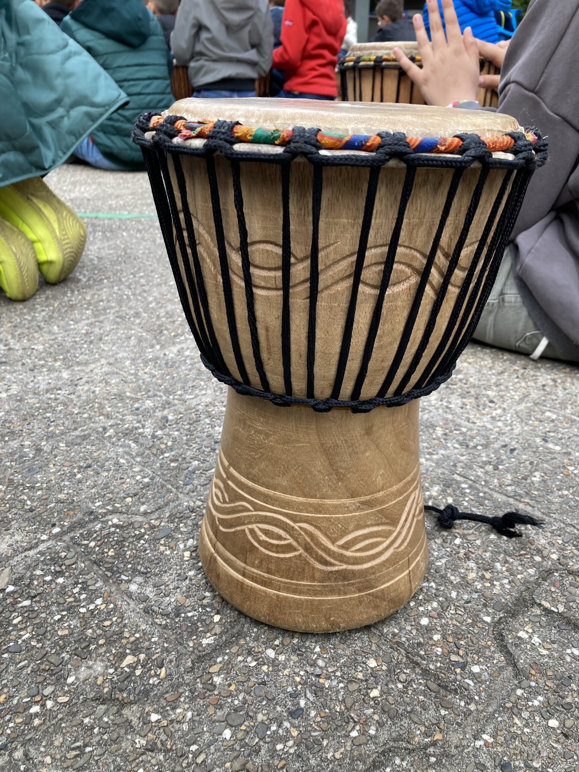 Jeder Schultag begann mit einem gemeinsamen Trommeln auf dem Schulhof, alle Kinder und Erwachsenen starteten den Tag mit einem gemeinsamen Rhythmus.