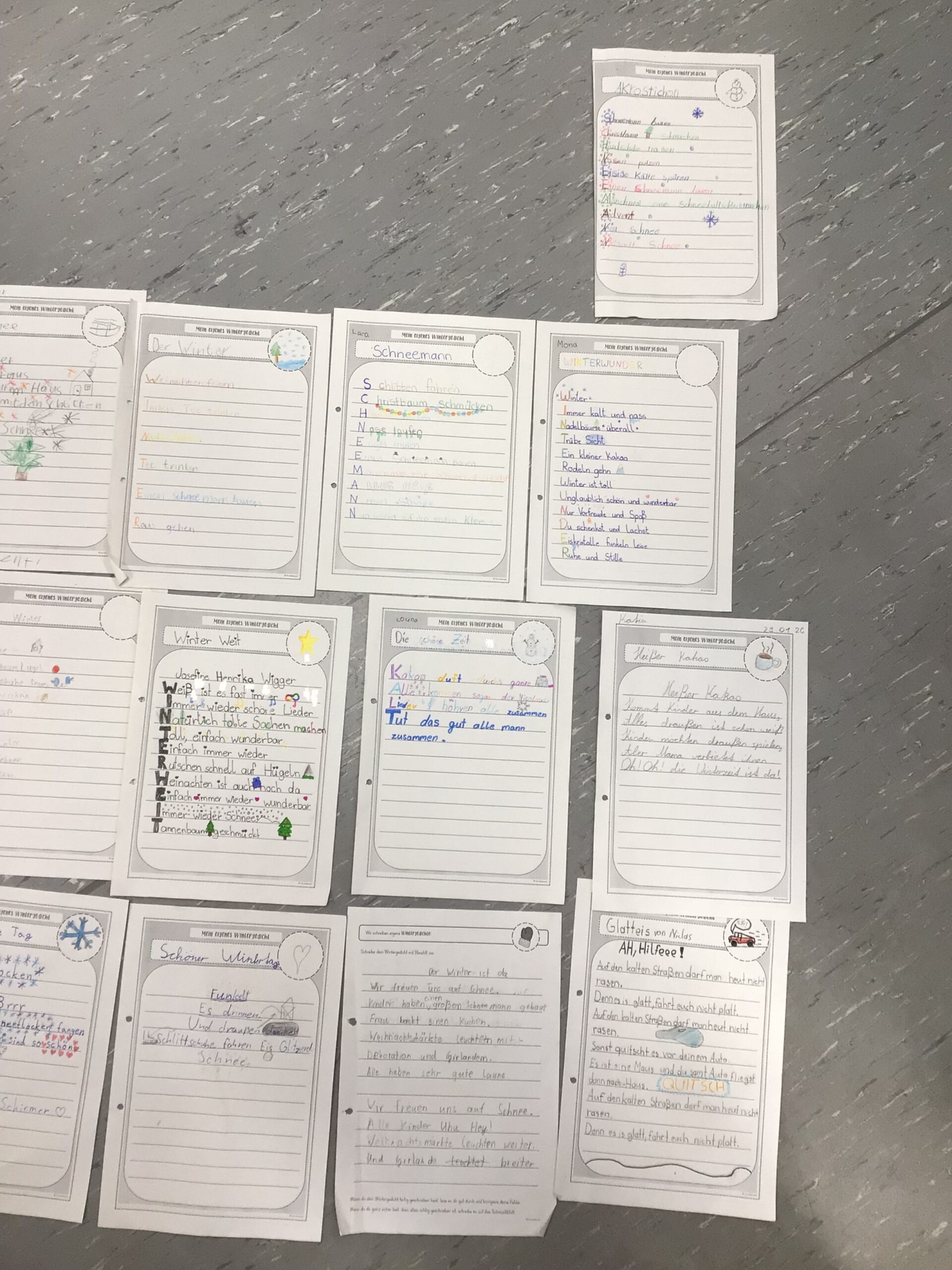 In der Klasse 4a entstanden im Rahmen einer winterlichen Gedichtewerkstatt viele kreative Texte rund um das Thema Winter. Die Kinder lernten verschiedene Gedichtformen kennen und schrieben eigene Elfchen, Akrosticha und Rondelle. Mit Fantasie und Freude verwandelten sie ihre Ideen in eigene tolle Wintergedichte.